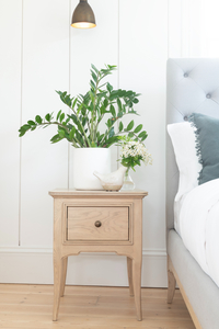 Carefully selected for their alluring grain character the oak solids and veneers are hand finished with white hue laquer. Authentically aged brass handles complete the aspirational curated look.