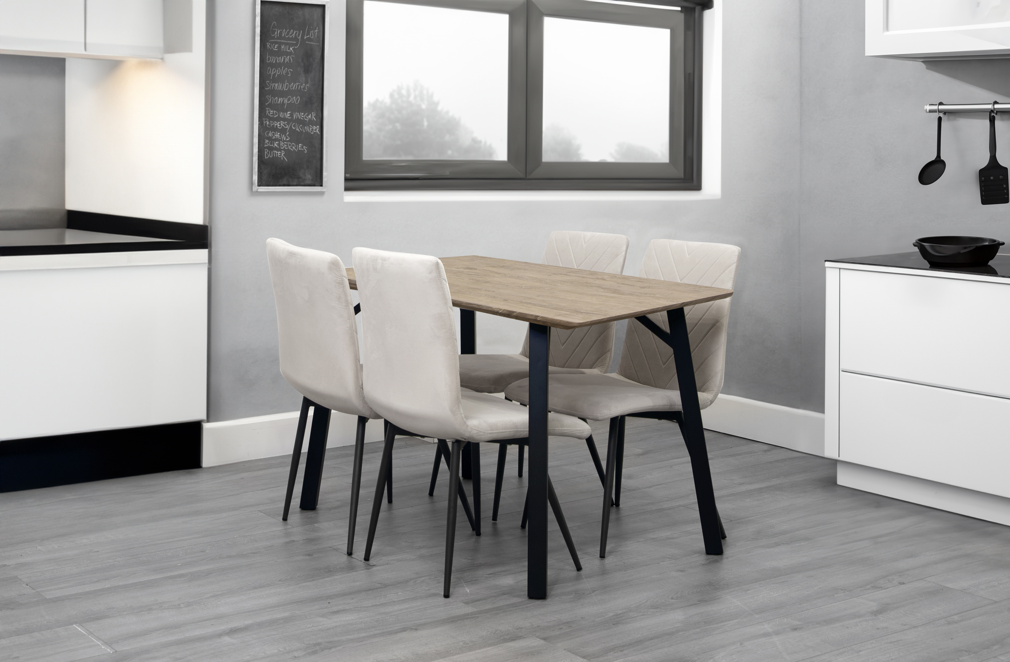 "Features • Sturdy Iron legs with Black Powder coating • Easy to follow assembly guide • Can seat 4 Chairs • Stylish and on trend Table and chair set • Amazing value without comprimising on quality"