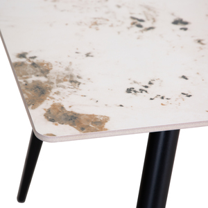 "Features • Heat & Scratch Resistant Table Top • Modern Black tapered legs • Easy Assembly • Stone table top with natural markings • The tables durability is great for all households"