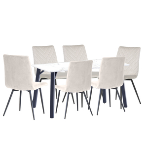 "Features • Sturdy Iron legs with Black Powder coating • Easy to follow assmbly guide • Can seat 6 chairs, 1 each end and 2 either side • Stylish and on trend Table and chair set • Amazing value without comprimising on quality"