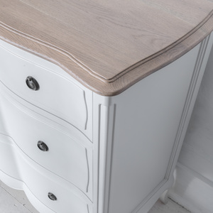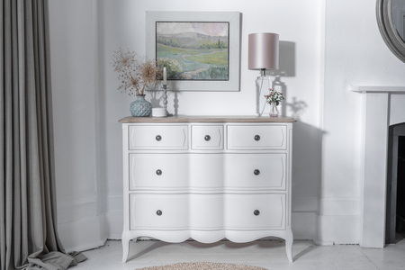 A unique and highly desirable bedroom collection celebrating the curvaceous forms found in classical French joinery. Each piece of Amelie furniture is carefully created by hand. The soft undulating bow fronts and elegant sweeping curves of the cabinets and beds are the signature details of this beautifully constructed range.A soft dove grey finish is applied and accented perfectly by the burnished brass hardware. The muted colour palette is completed with the subtle lime washed oak top panel and the natural linen used on the bed upholstery.Simply, Amelie is a truly unique bedroom collection crafted by artisans exuding a timeless boutique appeal.