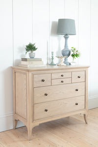 Carefully selected for their alluring grain character the oak solids and veneers are hand finished with white hue laquer. Authentically aged brass handles complete the aspirational curated look.