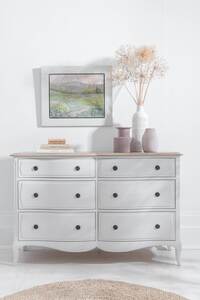 A unique and highly desirable bedroom collection celebrating the curvaceous forms found in classical French joinery. Each piece of Amelie furniture is carefully created by hand. The soft undulating bow fronts and elegant sweeping curves of the cabinets and beds are the signature details of this beautifully constructed range.A soft dove grey finish is applied and accented perfectly by the burnished brass hardware. The muted colour palette is completed with the subtle lime washed oak top panel and the natural linen used on the bed upholstery.Simply, Amelie is a truly unique bedroom collection crafted by artisans exuding a timeless boutique appeal.