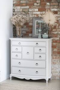 Taking its inspiration from the elegant style of 18th century French chateau furniture.Etienne is the sister range to Ivory, made of solid wood and veneers, with a new soft grey painted finish. A subtle patina and distressed effect to the detailed hand carvings gives added interest to the pieces and are complemented with antique effect pewter handles. With a comprehensive range of twenty four pieces, there is bound to be a combination to suit every size of bedroom.
