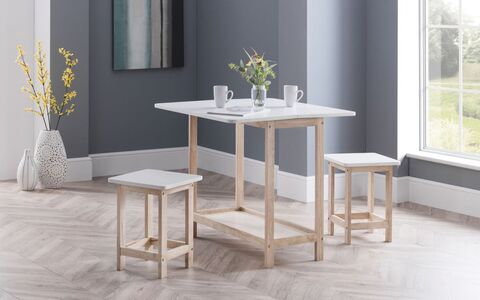 The Bergen Bar set is ideal for smaller kitchen and dining areas with limited space. The two stools sit neatly on the bottom shelf, whilst the table top is fixed on wooden runners allowing the top to slide toward you and fold down. This space saving design means the dining set can be stored out of the way at ease when not in use. The two-tone combination of white and natural creates a mixture of modern and country style, perfect for a wide range of décor.