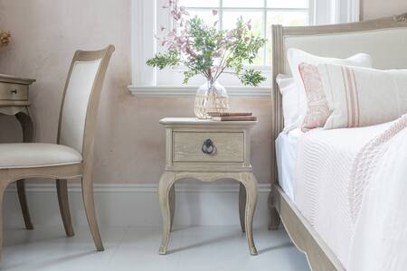 You don''t have to live in a castle to love Camille - a romantic collection of elegant bedroom furniture. Crafted from solid oak and veneers with a beautiful aged finish and natural linen upholstery on the beds. Hand carved detailing finishes off this classic range Exuding the quality you would expect from WG furniture, Camille remains in a class of its own.