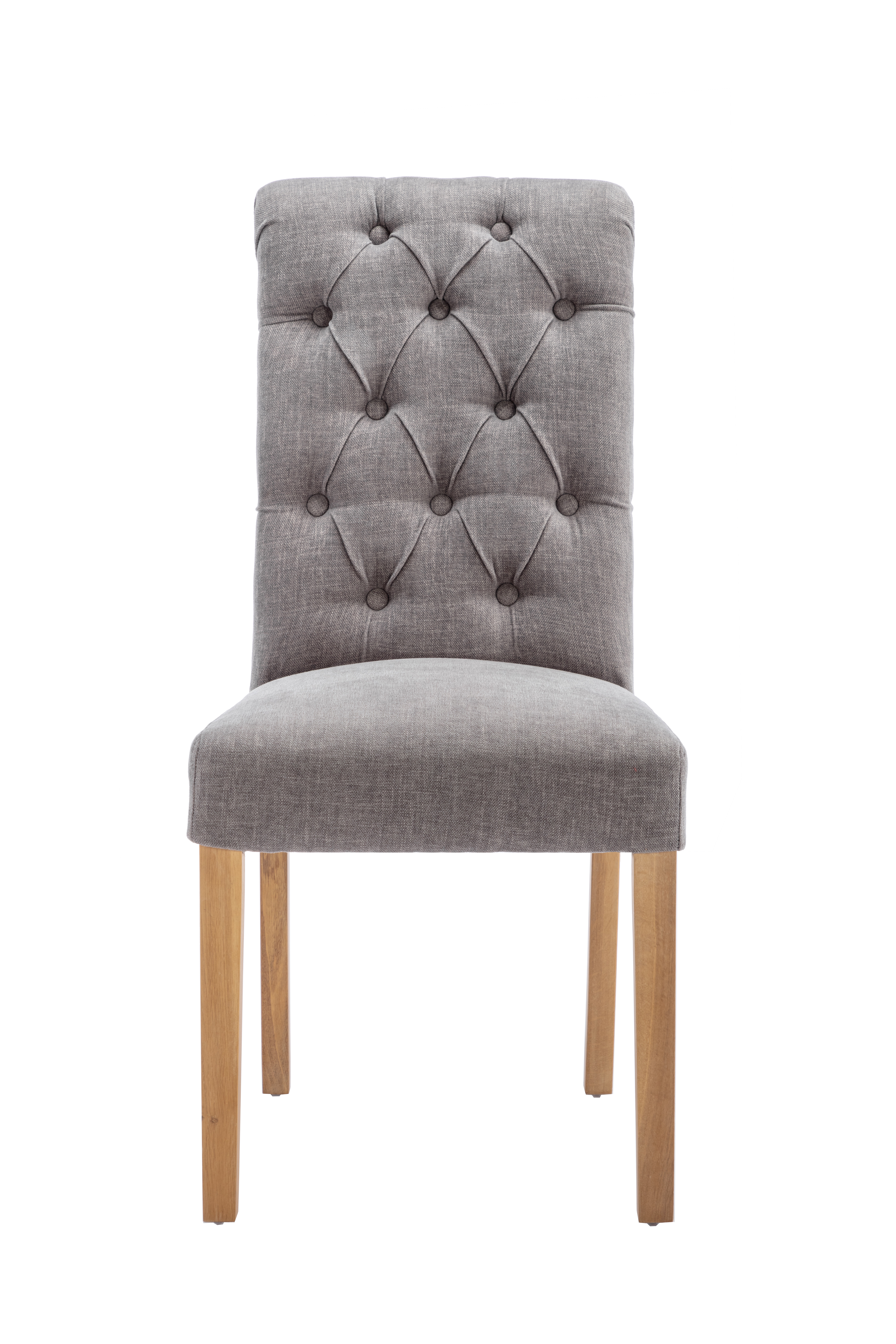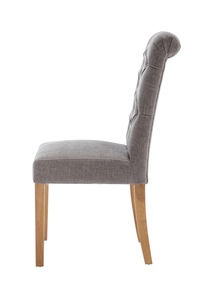 "Features • 100% Polyester Fabric • Scroll Back Design • Button back • Oak legs • Cushioned seat pad "