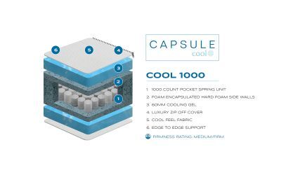 Experience the Capsule Cool Mattress, designed to provide a serene and temperature-regulated sleeping experience. This innovative mattress features a cutting-edge cooling fabric that delivers an exceptionally restoring sensation. Paired with a 60mm internal cooling gel layer, it forms a powerful defence against overheating during sleep. Crafted with comfort in mind, the mattress features a 1000 count spring unit that provides optimal support and alignment for your body, ensuring a restful nights sleep. This mattress includes a luxurious zip-off cover for easy care and maintenance.