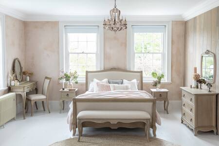 You don''t have to live in a castle to love Camille - a romantic collection of elegant bedroom furniture. Crafted from solid oak and veneers with a beautiful aged finish and natural linen upholstery on the beds. Hand carved detailing finishes off this classic range Exuding the quality you would expect from WG furniture, Camille remains in a class of its own.