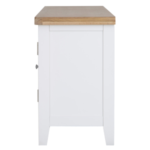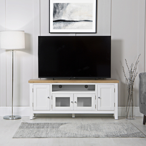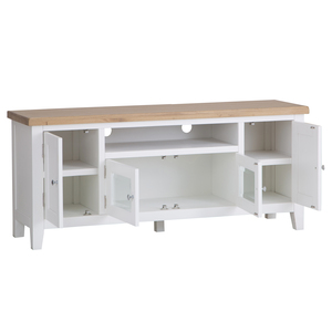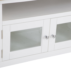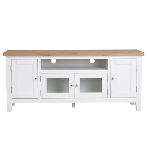 "Features • Open Shelf for Media Players, 3 internal shelves • Cable holes in back of the unit • 2 cupboard doors and 1 middle double door • Tapered Legs • Available in Grey or White finish. "