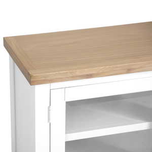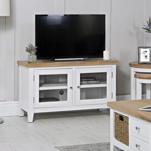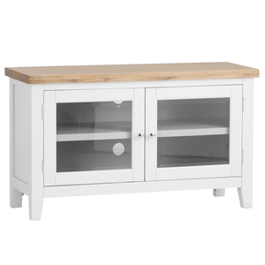 "Features • Glazed cabinet doors • Cable holes in back of the unit • Fixed interal storage shelf • Chrome knob • Available in Grey or White finish. "